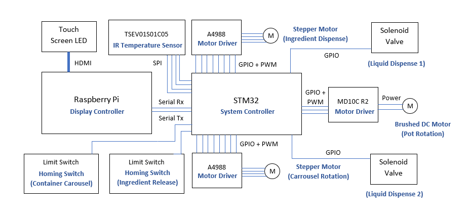 The CookMate system can be divided into two broad components – an automated system of sensors and actuators, and a human interface device that provides high-level control of the system and reports feedback to a user.